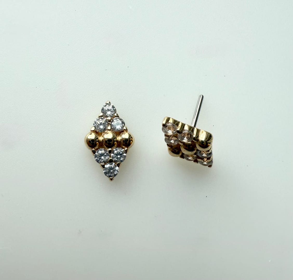 This beautiful threadless end is 14k yellow gold. Overall the piece is about 4x6mm featuring cubic zirconia. This threadless top fits any universal threadless labrets, barbells, and shafts. Labrets sold separately in the Barbells/Labrets/Curves category.
