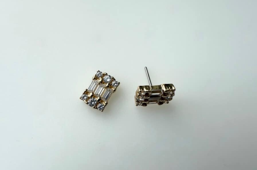 This beautiful threadless end is 14k yellow gold with a cluster round and baguette cubic zirconias. Overall the piece is about 5x4mm. This threadless top fits any universal threadless labrets, barbells, and shafts. Labrets sold separately in the Barbells/Labrets/Curves category.
