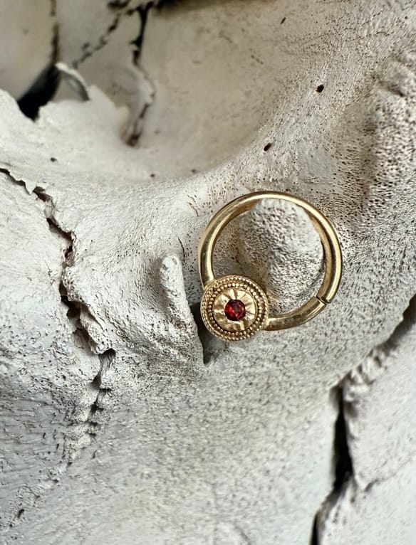 This beautiful piece comes to us from Moll Doll Designs. Featuring 14k gold, an array of textures and beading, and a 2mm genuine garnet. This seam style ring bends back and forth for easy changing. The ring itself measures to 16g 11/32”, and the shield is 5.5mm. From the top of the shield to the ring is about 1/4”