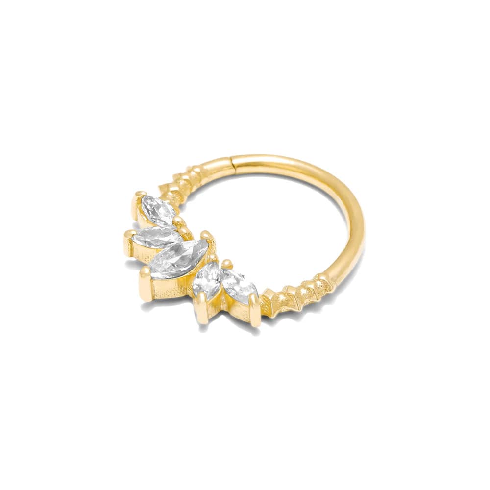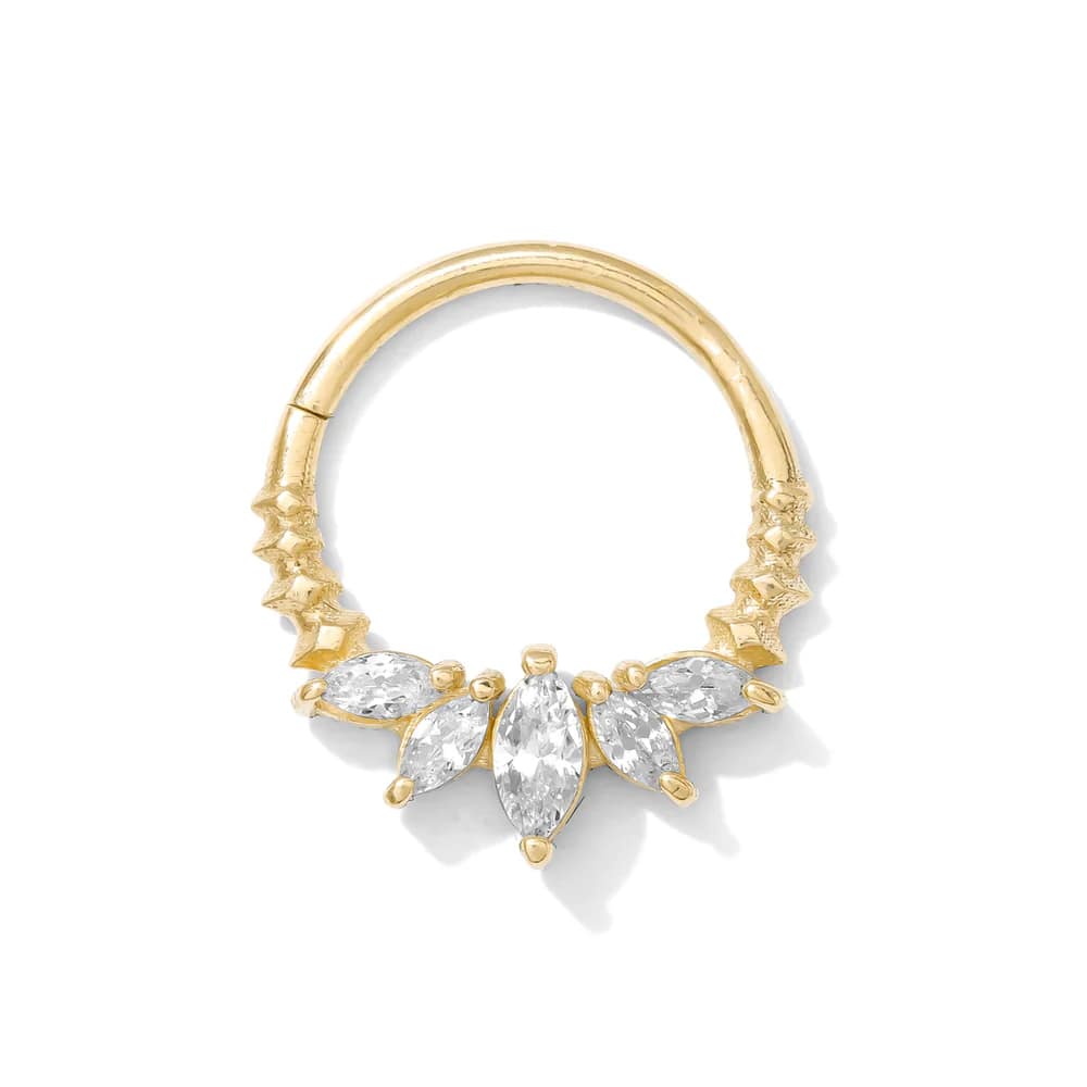 This beautiful seam style ring comes to us from Tawapa. Featuring cubic zirconia and 14k yellow gold, this 16g 5/16” ring bends back and forth for easy changing.